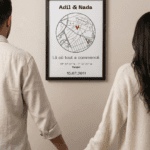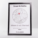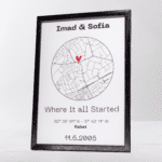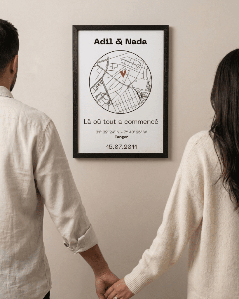 Certains lieux restent gravés dans le cœur pour toujours. Cette création a été pensée pour faire revivre l’émotion attachée à un endroit qui a compté dans votre histoire. Il peut s’agir d’une rencontre, d’un départ, d’un retour, d’un premier foyer ou d’un moment décisif. Ainsi, ce cadre carte personnalisé ne représente pas seulement un lieu. Il capture aussi une mémoire, une émotion et un lien profond. Plus qu’un objet décoratif, il devient un rappel quotidien d’un moment précieux, transformé en souvenir tangible et intemporel.